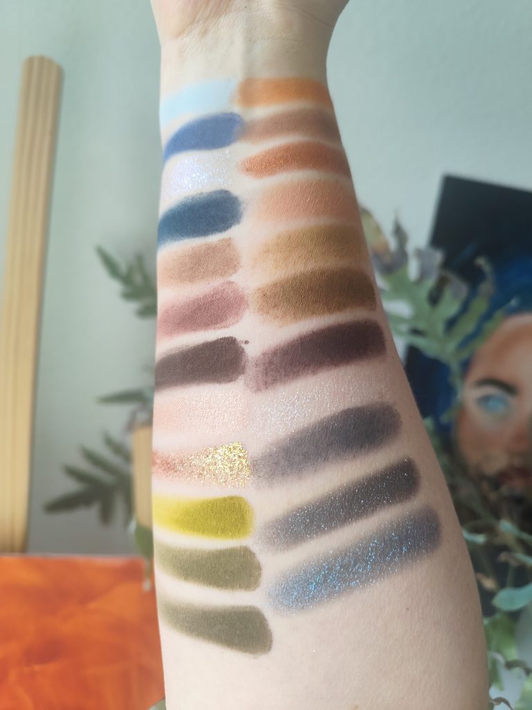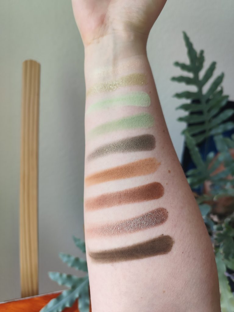 Ich mag die Palette echt gerne. Es wird alles für einen – für mich – runden Look abgedeckt. Es gibt einen hellen, mittleren und dunklen Braunton, ein helles, mattes Grün und auch schöne helle und dunkle Schimmer.