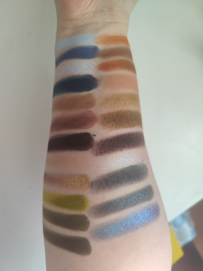 Ich habe die Palette in Quads geswatcht statt in Reihen wie sonst, weil ich eindeutig fand, dass die zusammen gehören. Auf der Haut waren die Swatches ganz okay, aber wirklich glänzen konnten die Shades dann auf dem Auge.