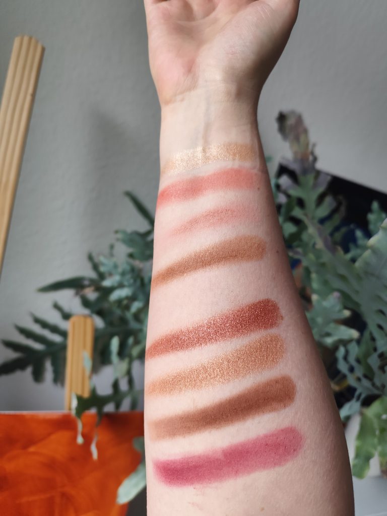 Ich zeige euch erstmal Swatches.. oben von der helleren Palette (01) und unten von der dunkleren (02).
